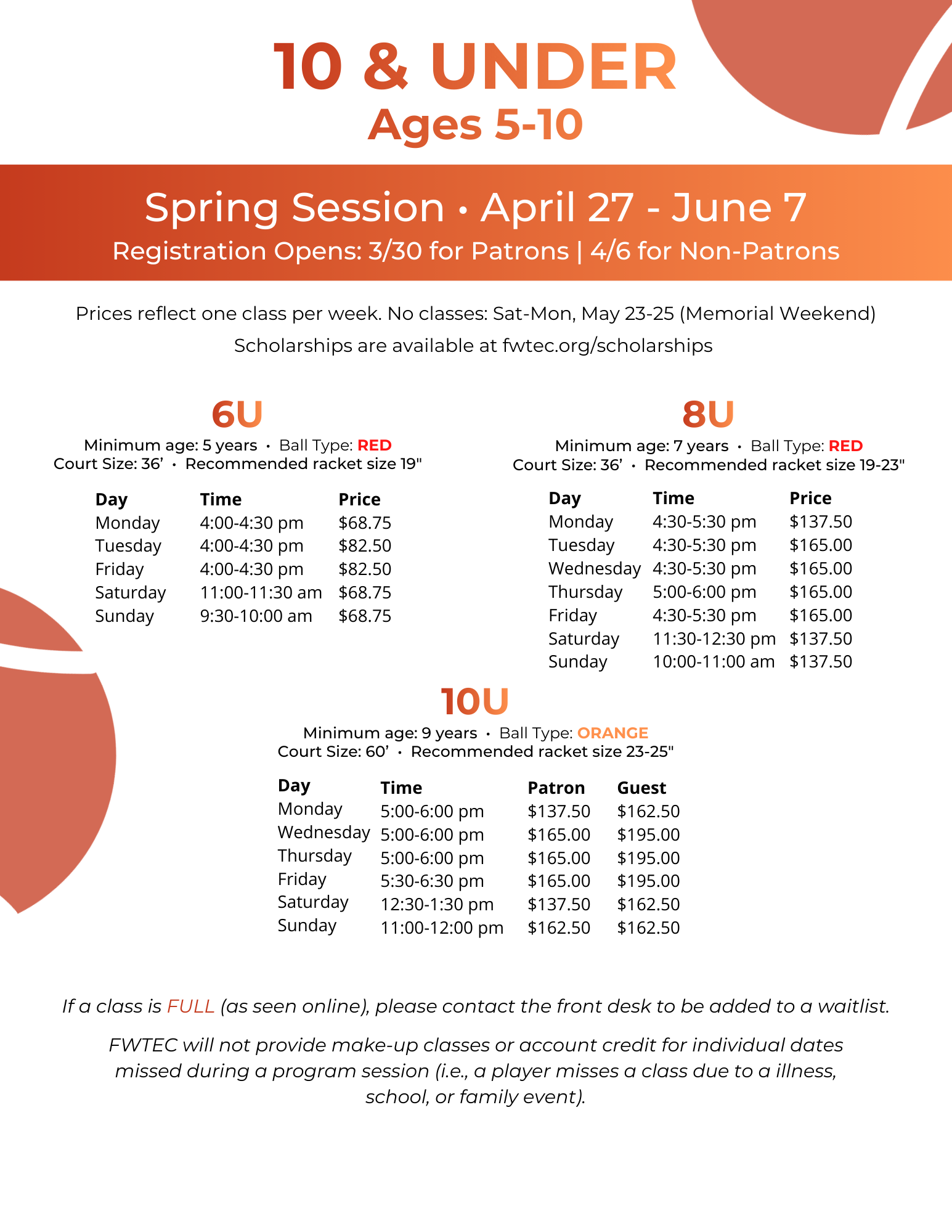 FWTEC will not provide make-up classes or account credit for individual dates missed during a program session (i.e., a player misses a class due to an illness, school, or family event).