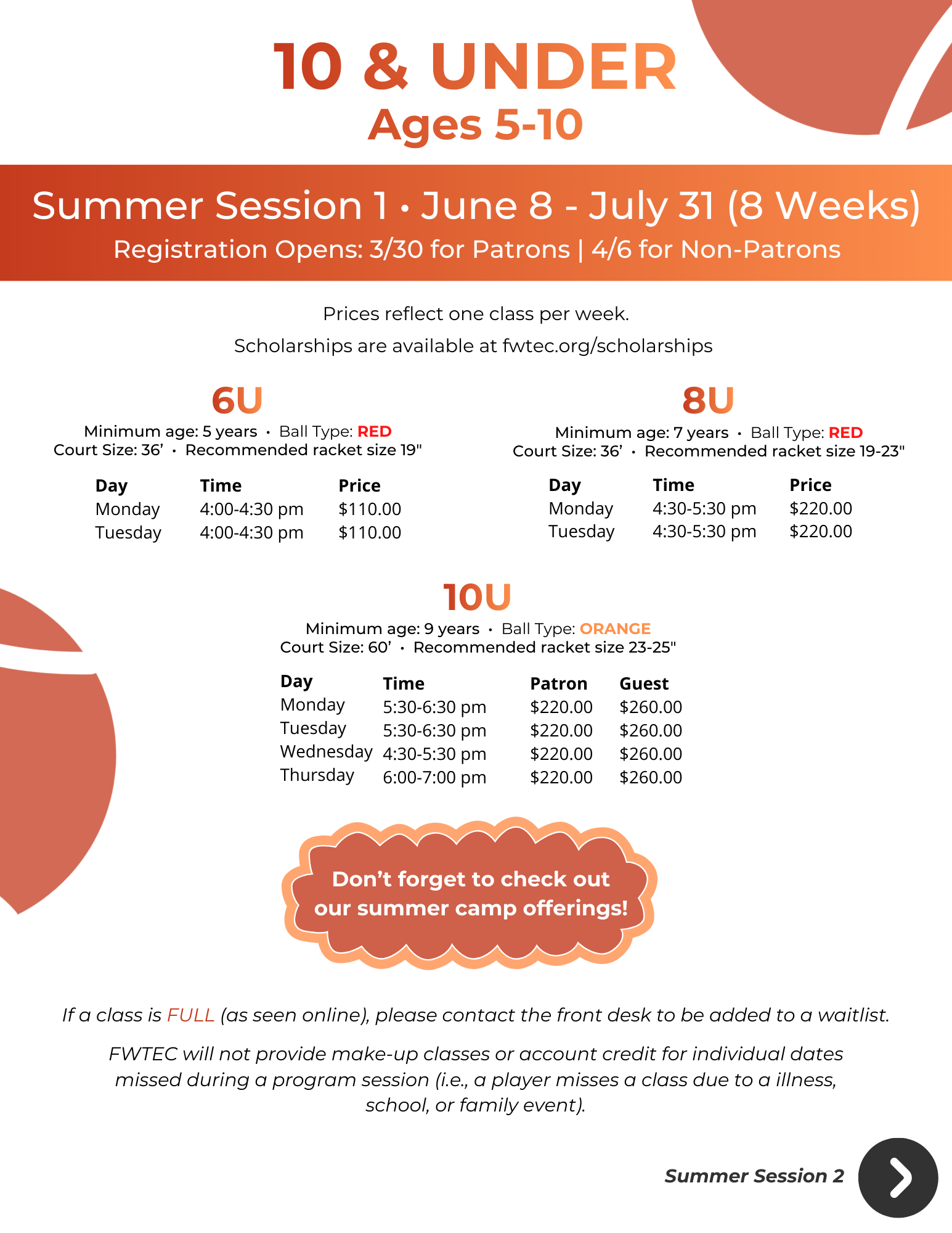 Minimum age is 5 years. The focus is on athletic development using the age-appropriate 36’ court and Red ball. This will help set the stage for their development as tennis players and athletes. Energetic coaches teach the fundamentals of the game through ‘Games Based” practices. There is no additional cost for non-members. *Recommended racket size is 19"