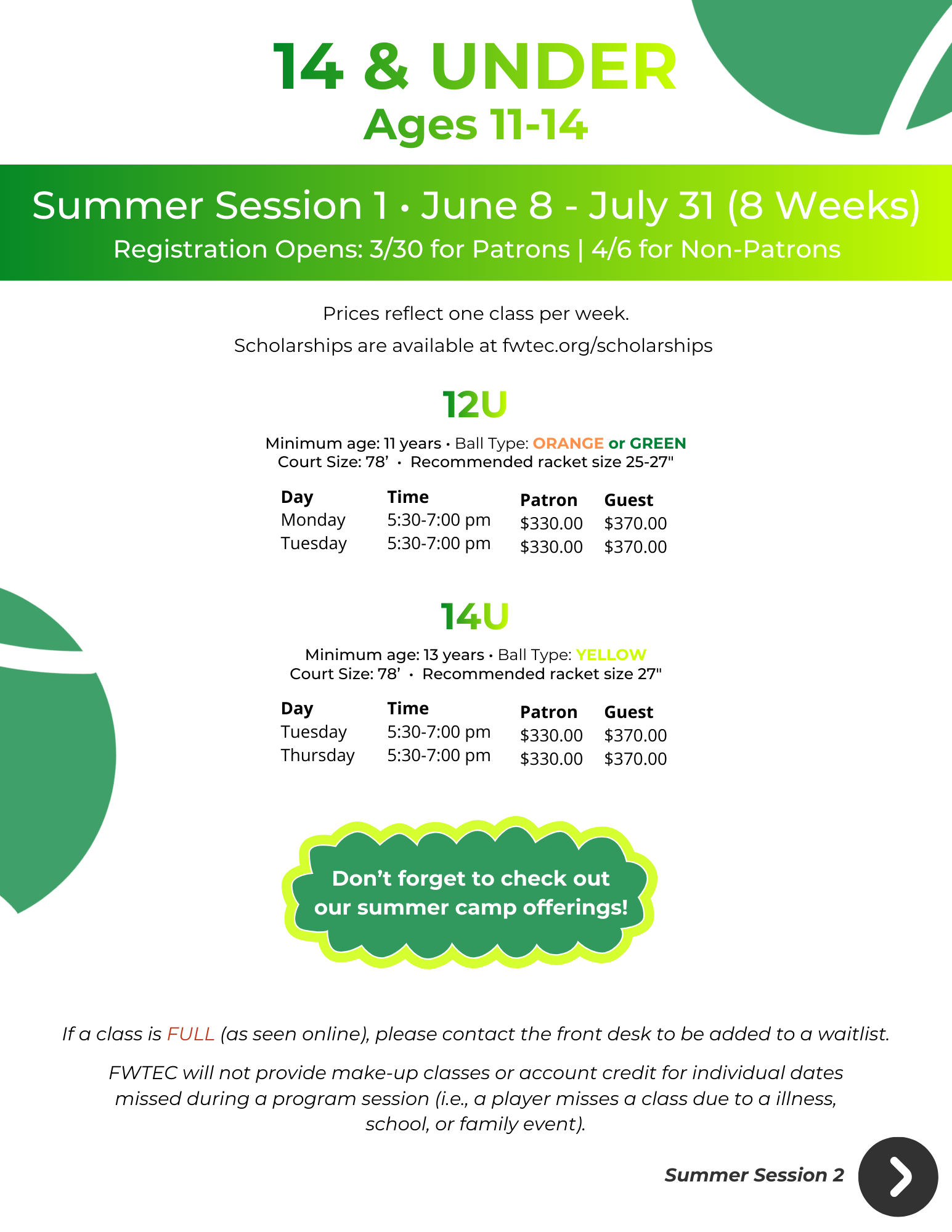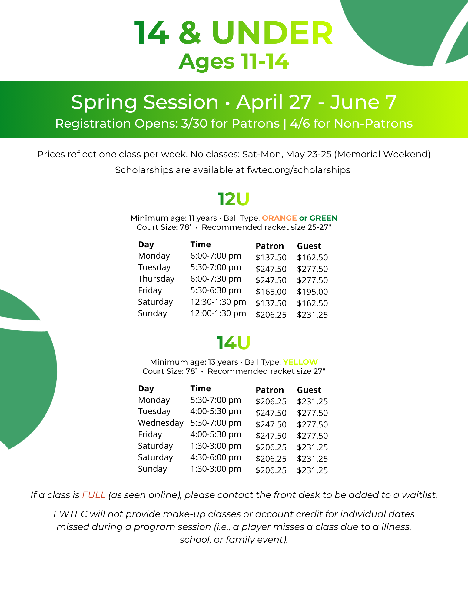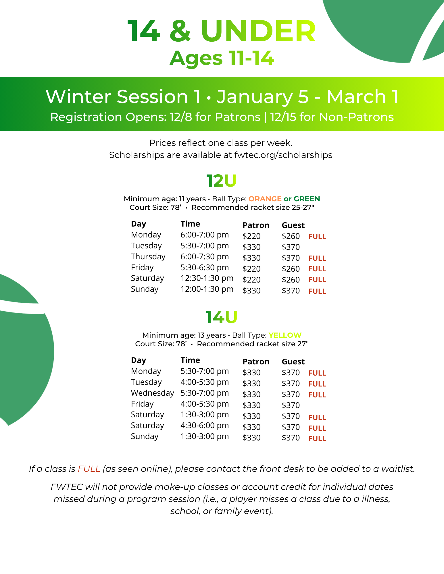 FWTEC will not provide make-up classes or account credit for individual dates missed during a program session (i.e., a player misses a class due to an illness, school, or family event).