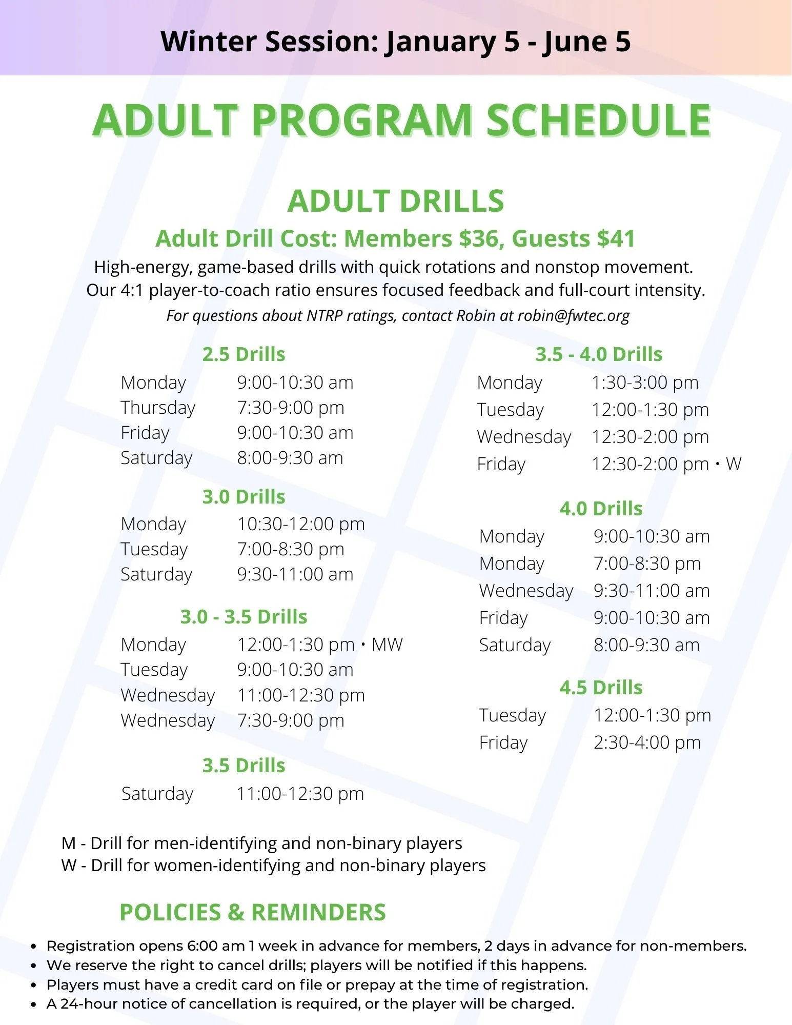 For questions about NTRP ratings, contact Robin Coverdale at robin@fwtec.org.